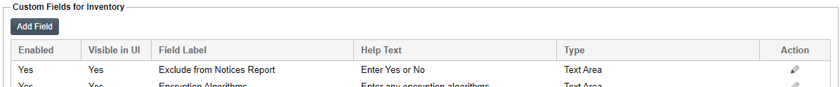 Click Save. The new custom field is added to the list of custom fields in the Custom Fields for Inventory section on System Settings tab. Additionally, the field's configuration determines its availability in Code Insight. For more information about the availability of the field once you save its definition, see Disabling or Re-enabling a Custom Field for Inventory.