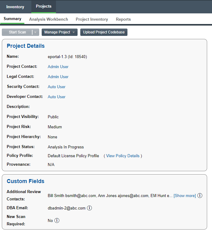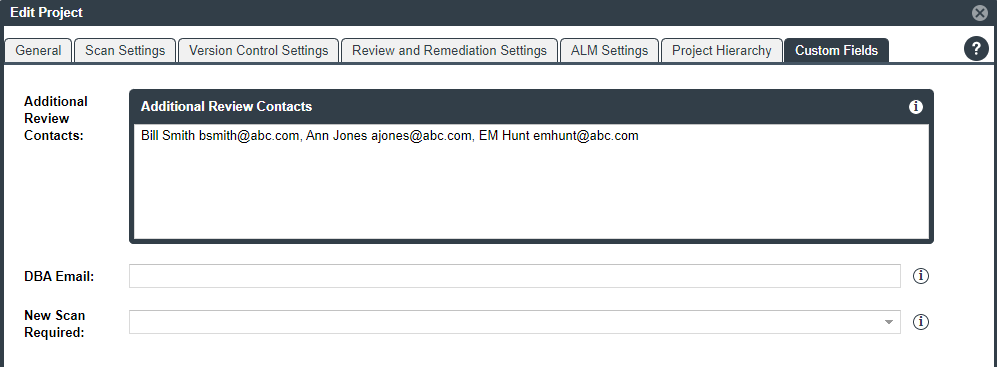 The following example shows three custom fields (Additional Review Contacts, DBA Email, and New Scan Required) on the Manage Project > Edit Project > Custom Fields tab for a project.