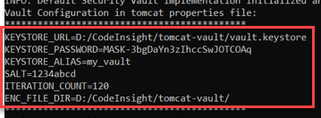 vault.bat --keystoreD:\CodeInsight\tomcat\tomcat-vault\vault.keystore--keystore-passwordpassword123--aliasmy_vault--enc-dirD:\CodeInsight\tomcat\tomcat-vault--iteration120--salt1234abcd--generate-configD:\CodeInsight\tomcat\conf\vault.properties -