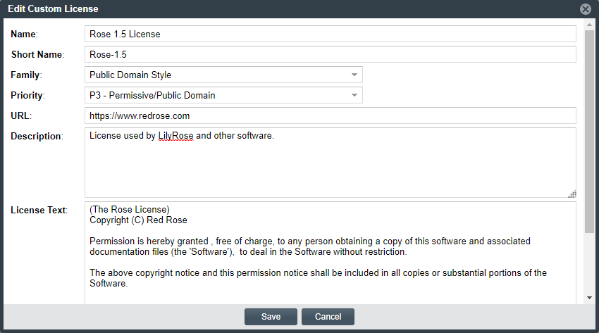From the Edit Custom License window, update the license properties as needed. For property descriptions, see Custom License Properties.
