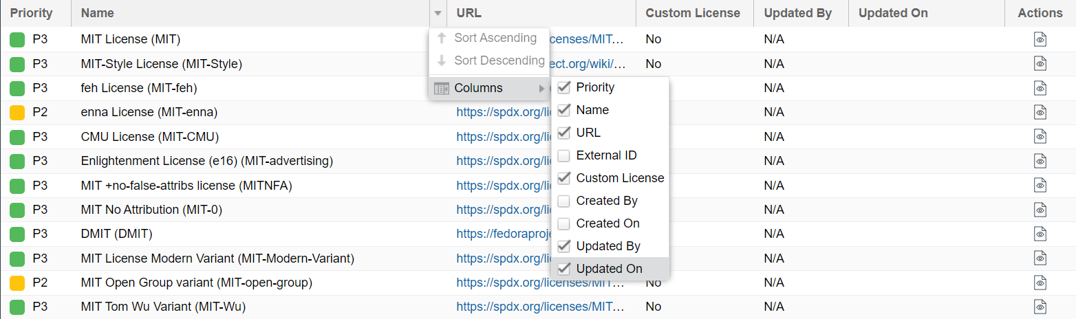 Once you have performed a successful search of licenses (the setup of which is described in Setting Up a Global License Search), the results are listed in a grid below your search criterion on the Global Component & License Lookup > Licenses tab. (For a complete description of the details shown for the licenses in these results, see Licenses Tab.)