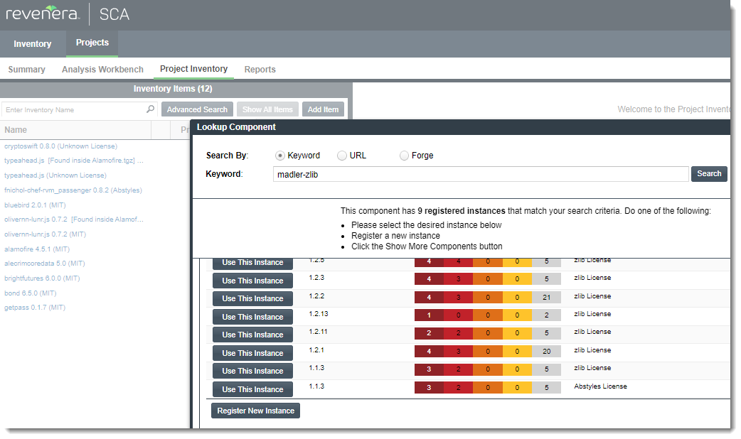 If a component version listed in Lookup Component window (accessed when creating or editing a component-based inventory item in the Analysis Workbench or in Project Inventory tab) has associated security vulnerabilities, a bar graph is visible showing the vulnerability counts for that version as stored at the system (global) level in the Code Insight Data Library.