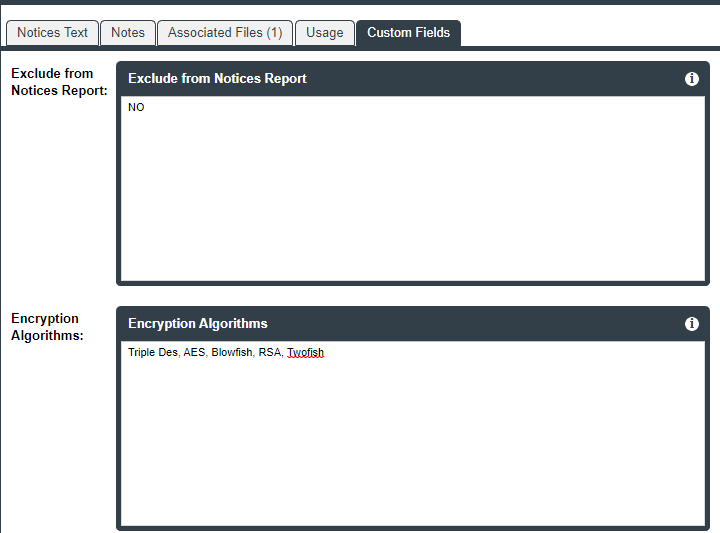 | Notices Text | The exact content to include in the Notices report. You can edit any license text previously saved to this field or manually add your own license text, such as license information for rules that you developed during your manual research on the inventory item. You can also copy the As-Found License Text content (see the previous description) to the Notices Text field and modify it as needed. As a third option, you can click the Update Notices Text button to pull a copy of the current license content from the Code Insight Data Library into the Notices Text field and modify it as needed. Alternatively, you can leave this field empty. Click Save at the top of the field if you make any changes to this field. If you provide information in this field, the Notices report pulls the content of only this field into the report. If this field is empty, the content of the As-Found License Text field is used in the report. If both fields are empty, the report uses the license content from Code Insight Data Library (see License Details from the Code Insight Data Library). For more information, see Finalizing the Notices Text for the Notices Report. |