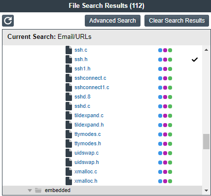 Click the option in the filter legend to identify how you want to filter the codebase files. Results are listed in the File Search Results pane.