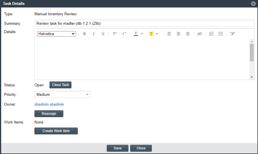 If the task type is Manual Inventory Review, select Approved or Rejected from the Resolution Type pop-up to indicate the task resolution. Then click Close Task from the pop-up. (To under stand how the resolution affects the status of the inventory item, see Effects of Closing Manual Review Tasks on Inventory Status.)