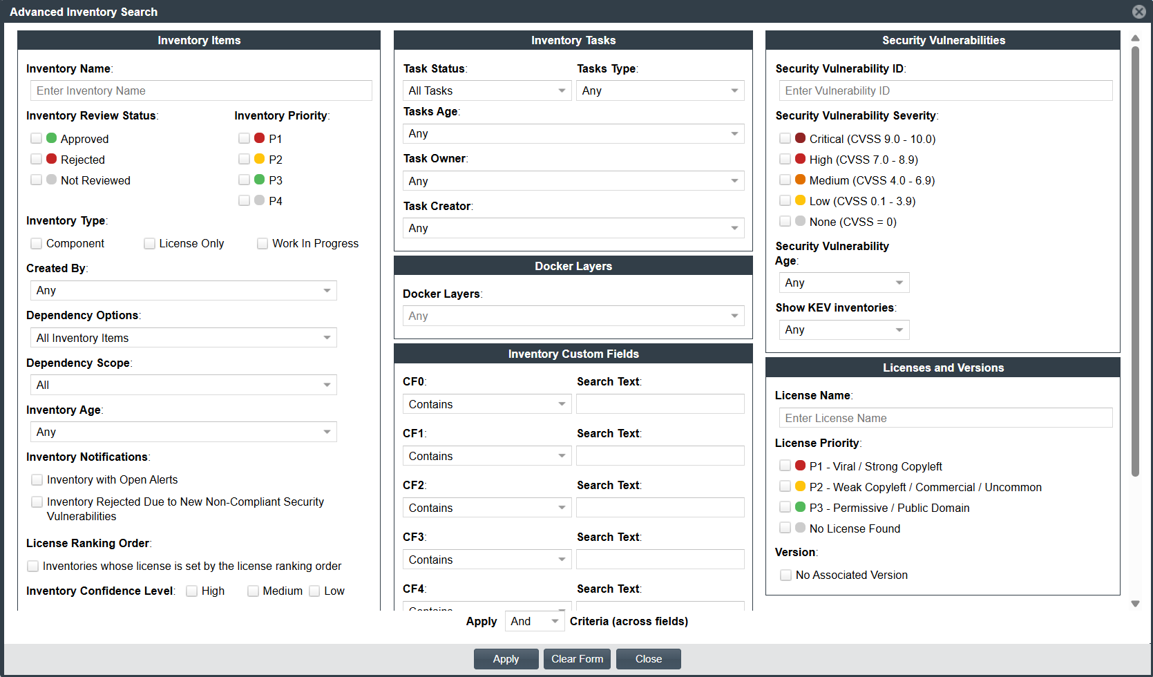 Code Insight provides the Advanced Inventory Search dialog that enables you to filter the list of published inventory items to those of interest based on many available criteria—inventory attributes, selected license attributes, as well as associated security vulnerabilities, tasks, Docker layers, and security alerts. In this way, you can easily focus on only those inventory items in which you are interested within the list of published items. The following procedure shows you how to access and use this dialog.